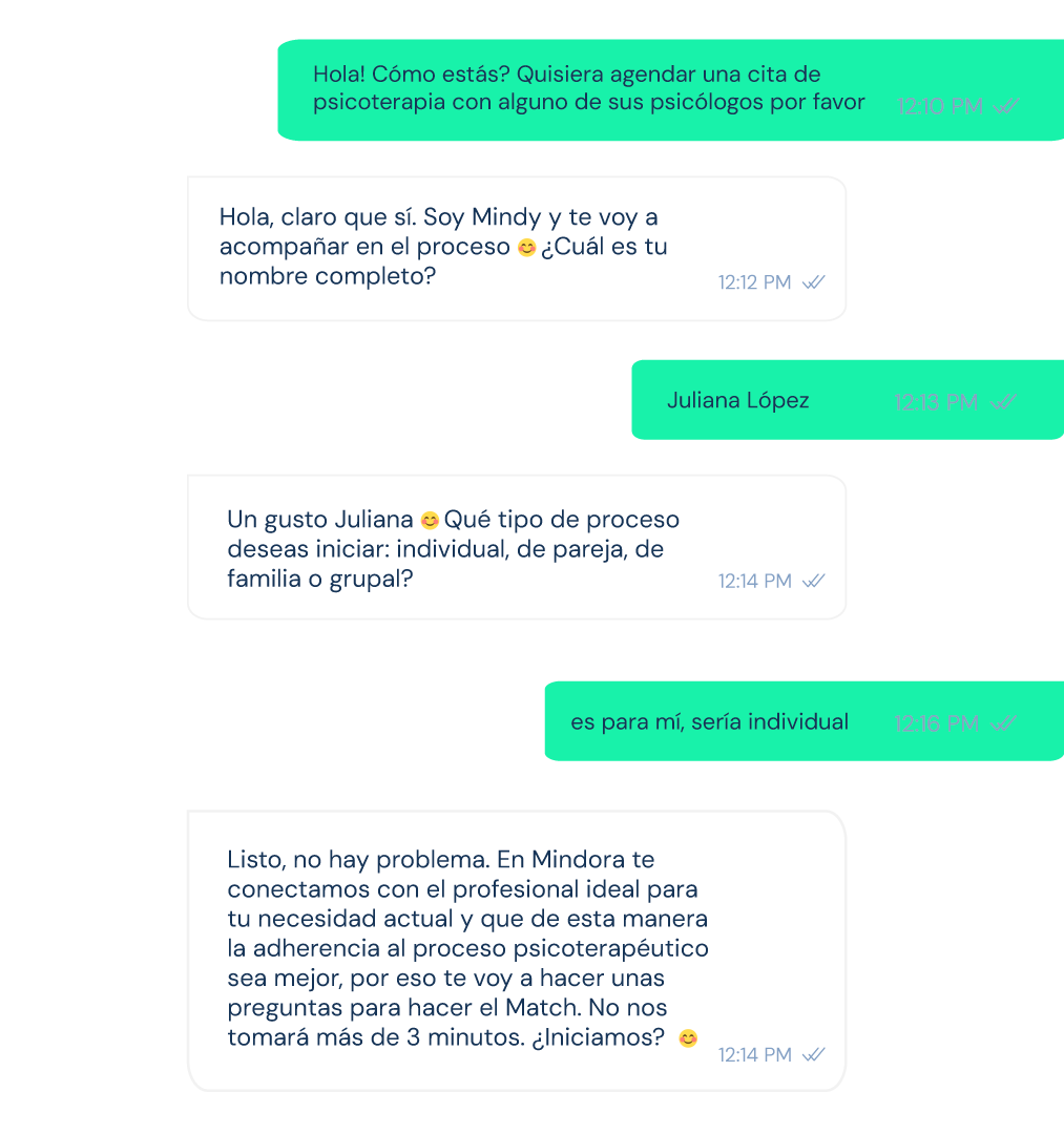 Con la ayuda de Mindy AI, analizamos tu perfil y las preferencias para identificar qué tipo de acompañamiento necesitas. A partir de esto, te conectamos con el terapeuta más adecuado, considerando afinidad, estilo de trabajo y especialización, garantizando una experiencia personalizada y efectiva.